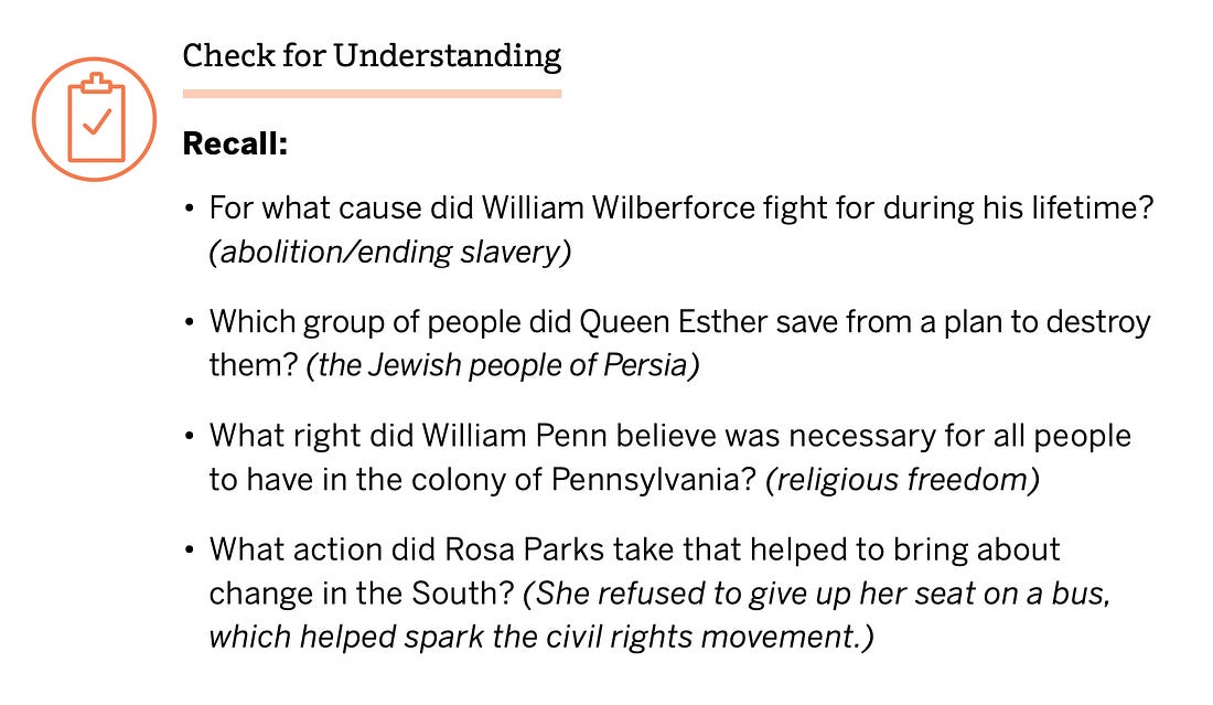 Uma aula do 2º ano sobre "Lutar por uma Causa" apresentou aos alunos "pessoas comuns que defenderam aquilo em que acreditavam e que lutaram por uma causa, mesmo enfrentando dificuldades imensuráveis". Isso soou maravilhoso! Os líderes mencionados na unidade incluíam Jackie Robinson , Dolores Huerta , Rosa Parks ... e a personagem bíblica Rainha Ester.