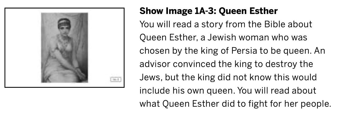 A Bíblia diz que Ester salvou o povo judeu ao frustrar um plano para exterminá-lo, e é por isso que ela foi incluída nesta unidade... mas, ao contrário de todos os outros, não havia nenhuma evidência de que ela realmente existiu. Os alunos nunca foram informados disso. Sua história recebeu o mesmo tratamento que a de Rosa Parks, que se recusou a ceder seu lugar no ônibus: