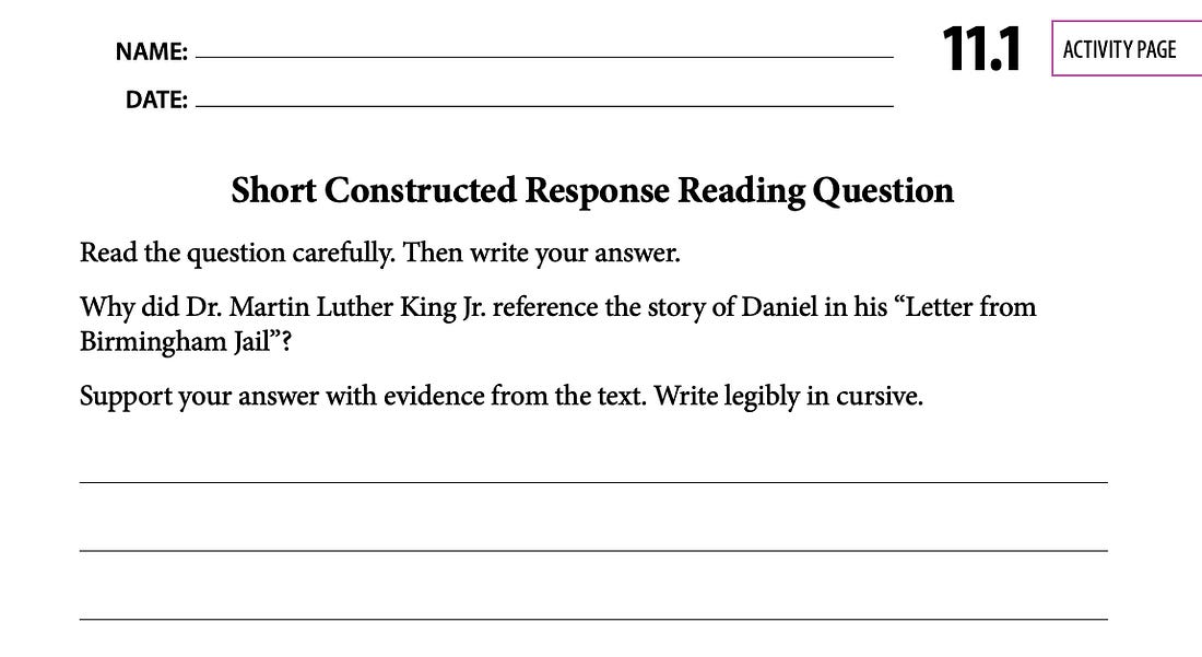 In the student activity book accompanying this unit, kids are asked to write a short response to the question, “Why did Dr. Martin Luther King Jr. reference the story of Daniel in his ‘Letter from Birmingham Jail’?”
