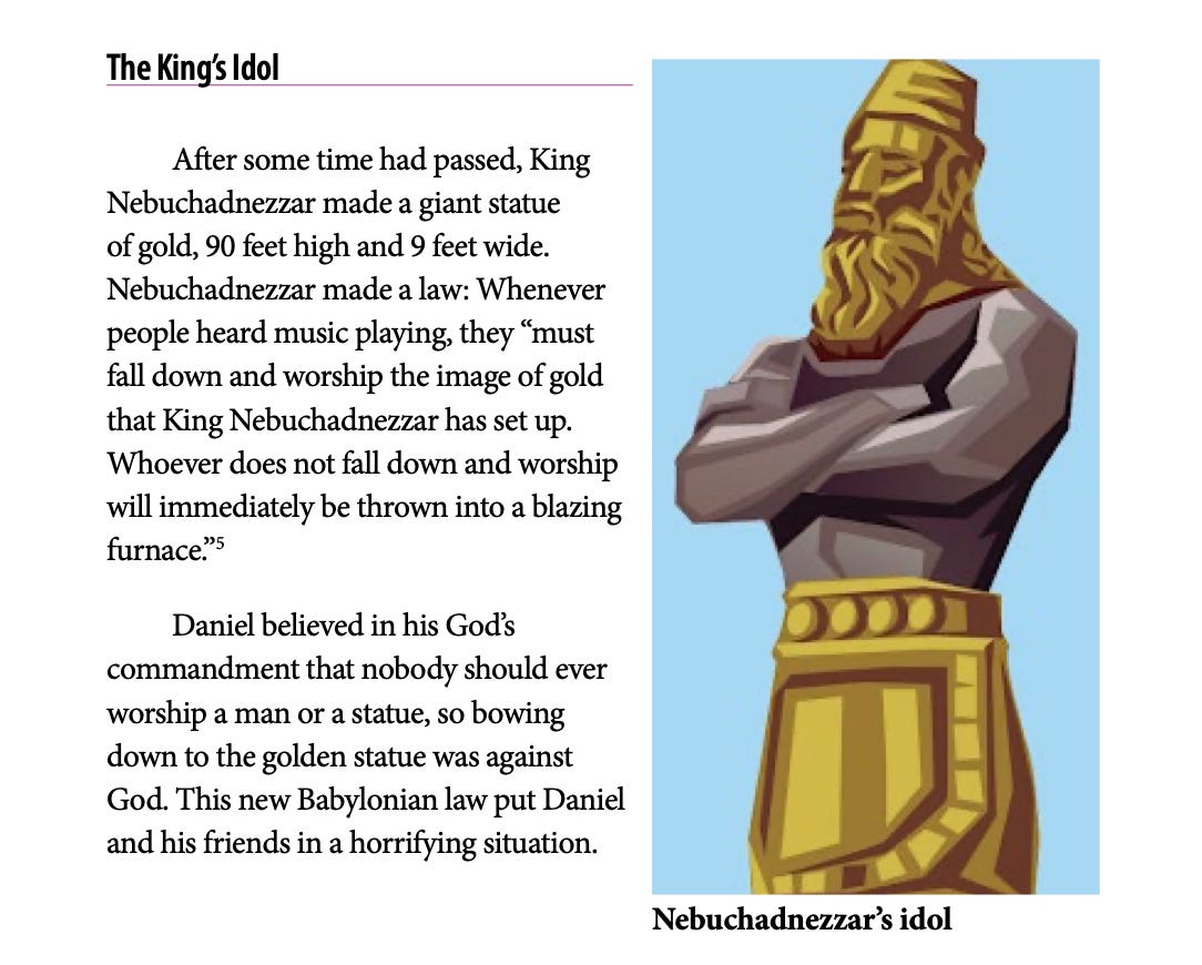 Você entendeu a ideia. Ao longo dessas aulas, o cristianismo era tratado como um fato. Os personagens bíblicos não eram mencionados como personagens , mas sim como pessoas reais da história. E sempre que a fé podia ser inserida em uma lição, ela era.